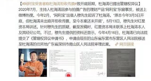 事发无偶,杜海涛也曾被爆出代言过爆雷的理财产品网利宝,不过其本人则极力否认代言,称只是为其拍摄过广告,并未签署代言合同。但不论是否真的代言,杜海涛都在一定程度上为网利宝吸引了消费者的注意。