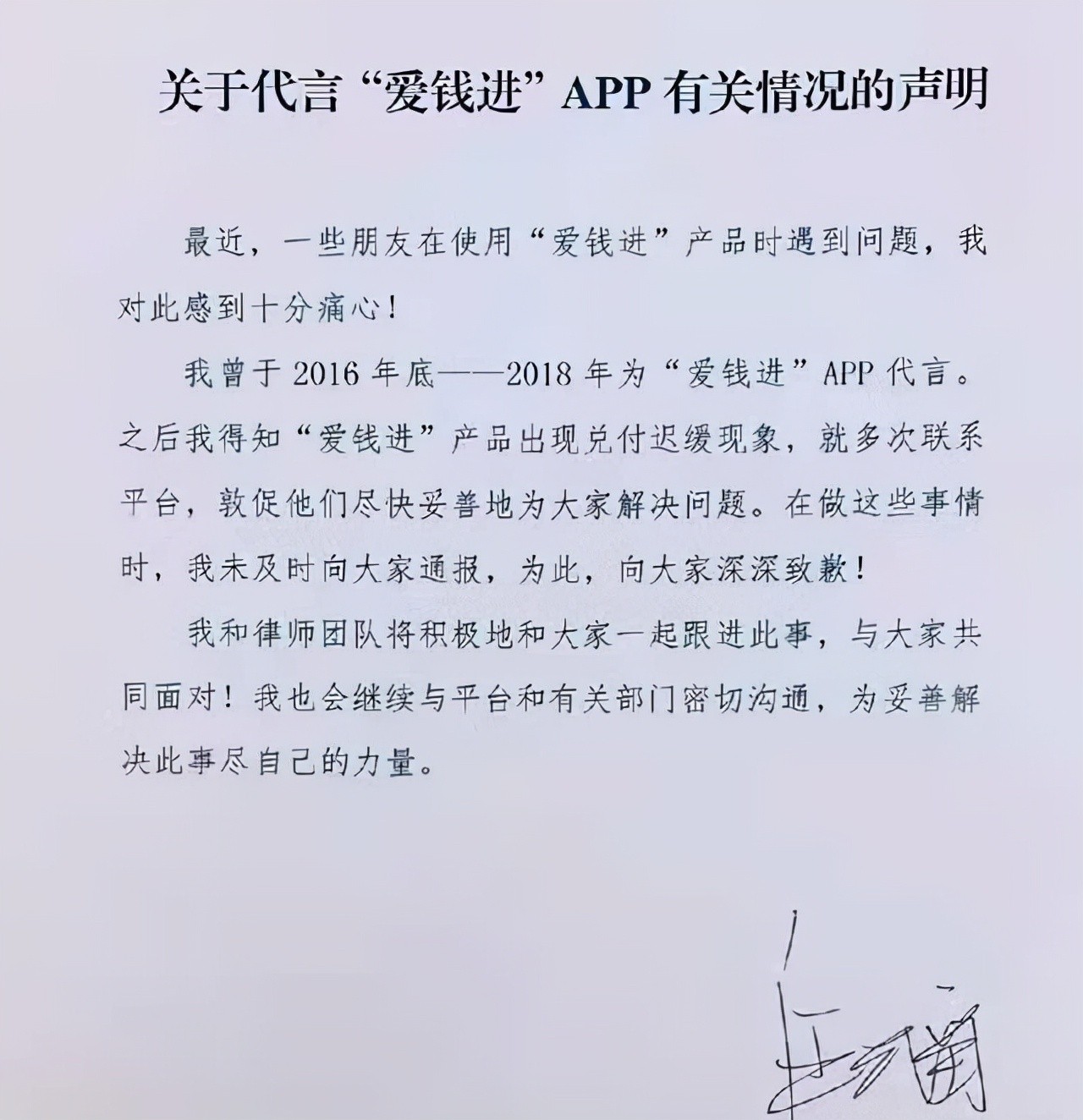 汪涵之前代言理财产品“爱钱进”事件也掀起过热议,据相关媒体报道,有超过10万人投资该款理财产品,结果品牌方卷钱跑路,导致很多投资者血本无归。事后,汪涵本人出来道歉,表示代言早在2018年就结束了,自己后续会协同律师和大家一起面对问题,争取早日解决。