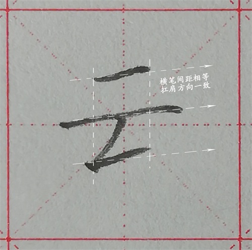 2、提笔和两横三者间距基本相等,提笔不可超过第一笔横的末端