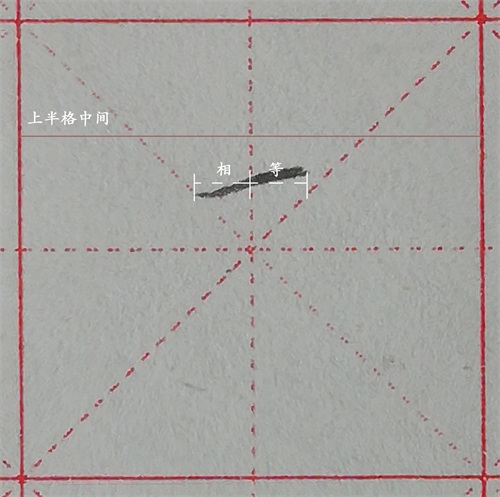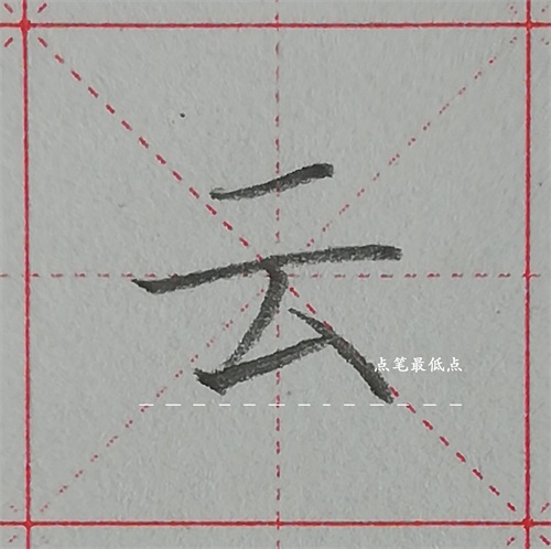 1、第一笔短横,从上半格中间偏下一点扛肩写短横,短横被竖中线平分