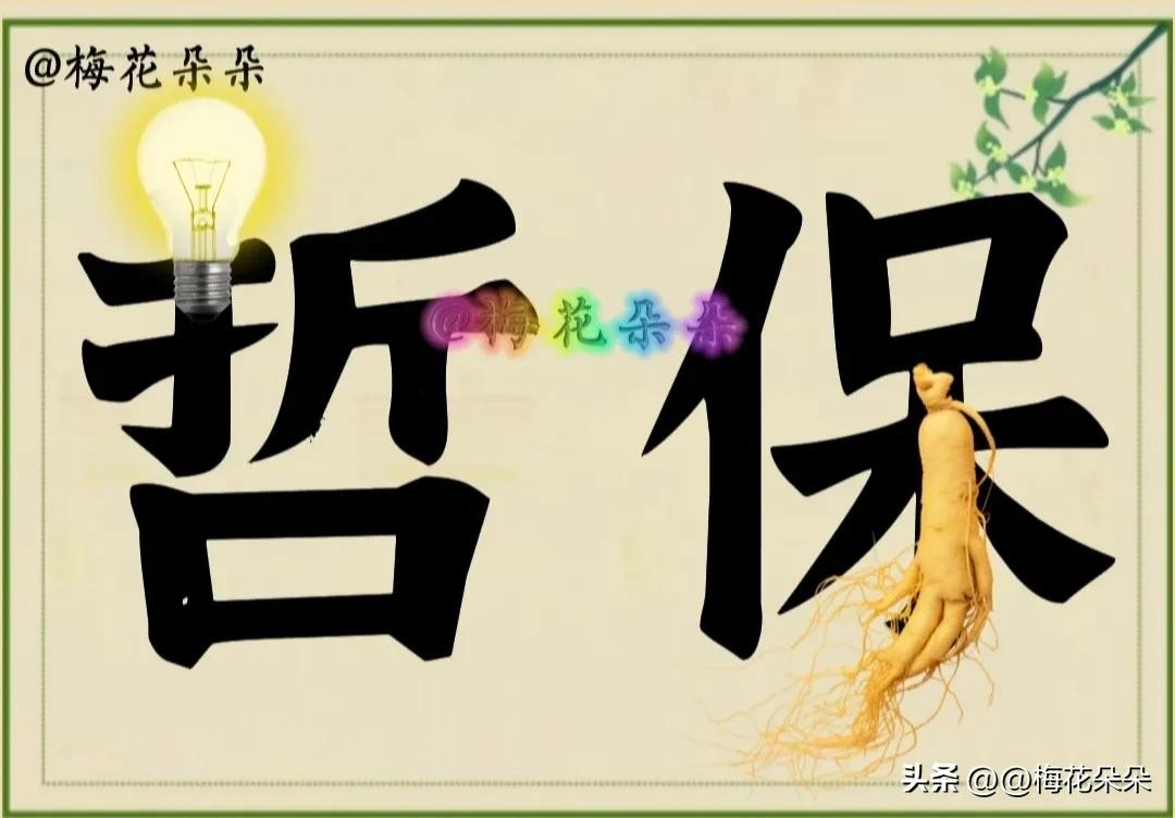 图片上有两个汉字,“哲”字上亮着一个灯泡,“保”字下面有一根人参。