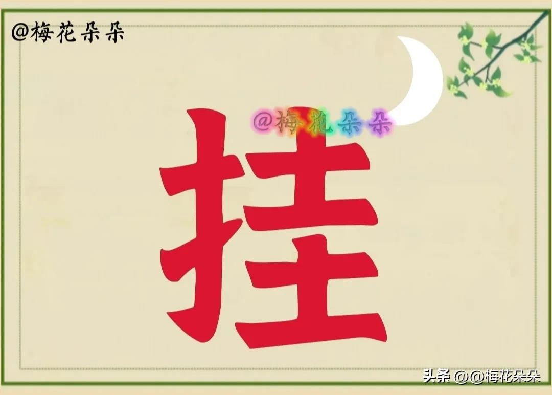 图片中有一轮白色的弯弯月亮,月亮的下面是红色的“挂”字。