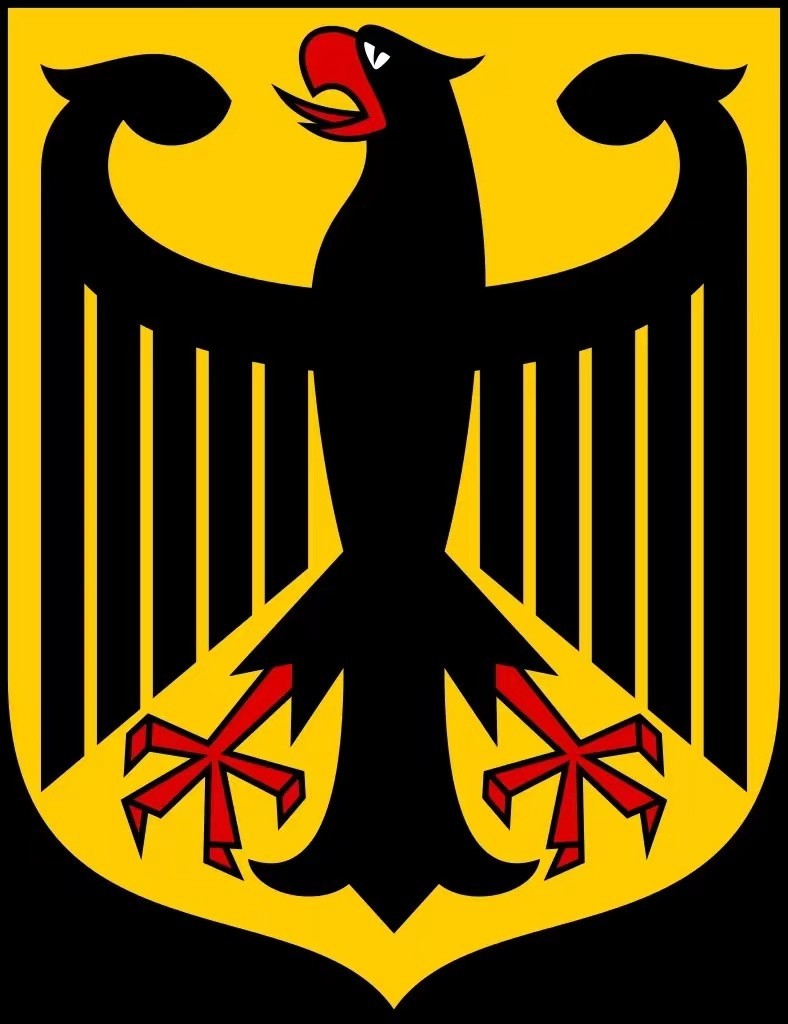 德国国徽为金黄色的盾徽,盾面绘有一只红爪红嘴、双翼展开的老鹰,称为“联邦之鹰”(德语:Bundesadler;昔日称为“Reichsadler”,意为“帝国之鹰”),黑鹰象征着力量和勇气,并与国旗的三种颜色相互辉映。此国徽重新使用了魏玛共和国的国徽设计 (1919 - 1935) ,于1950年被德意志联邦共和国政府采用。现行版本是1928年的设计,设计者是托比亚斯·施瓦布 (1887–1967)。现行国徽亦于1990年圣诞节前成为了两德统一后的德国新国徽。