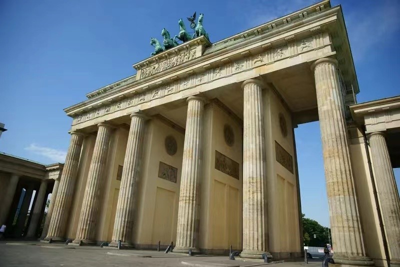 勃兰登堡门为德国柏林普鲁士王国的凯旋门。位于菩提树下大街西端。建于1788~1791年。仿照雅典神殿的大门而造,其上头有著名的4马牵引的“胜利战车”的铸像。1989年12月22日,东西柏林合并后重新开放。