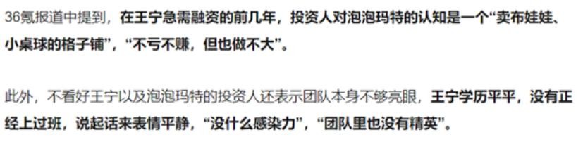 在他创业初期,并不被所谓「投资专家」看好,这些人对王宁的集体评价也是,说话没有感染力,缺乏领袖气质,泡泡玛特在王宁的带领下很难融资,成功希望渺茫。