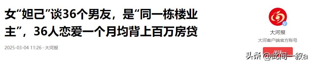大河报:2025年3月4日《女“妲己”谈36个男友,是“同一栋楼业主”,36人恋爱一个月均背上百万房贷》