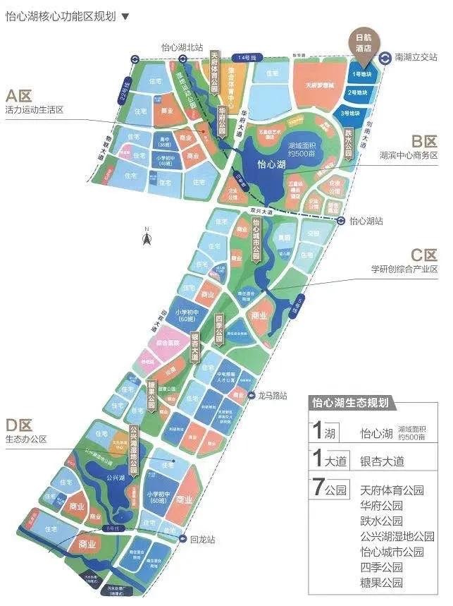 整个片区被分为ABCD4个功能区,通过绿带连廊的方式连接怡心湖和公兴湖,并引进先进的水生系统打造湖景和串联湿地,形成1湖(怡心湖)1大道(银杏大道)7公园(天府体育公园、华府公园、跌水公园、公兴湖湿地公园、怡心城市公园、四季公园、糖果公园)的生态格局。