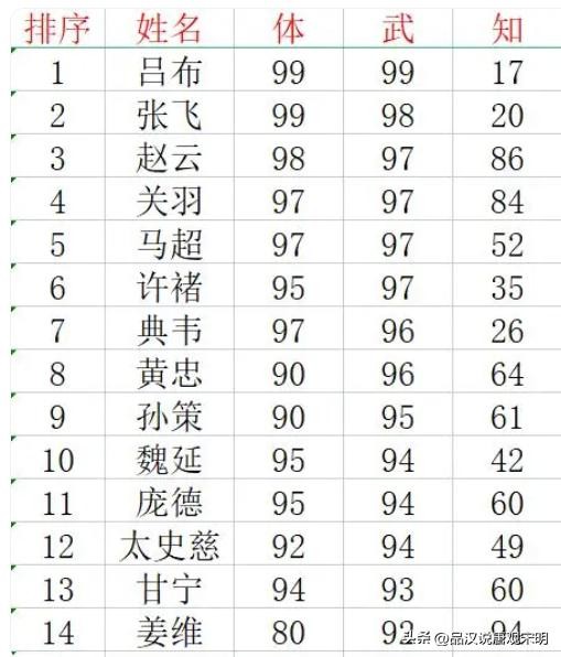 和前面动辄三四十,四五十位不同。能够进入一流和超一流武将榜单里的,不过十四位而已。