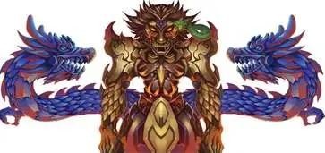 共工:蟒头人身,身披黑鳞,脚踏黑龙,手缠青蟒,北方水之祖巫。