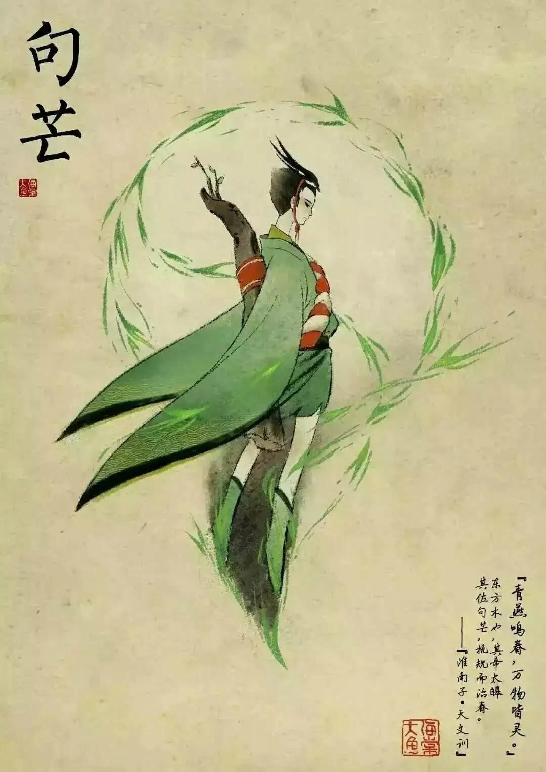 句芒:青若翠竹,鸟身人面,足乘两龙,东方木之祖巫。