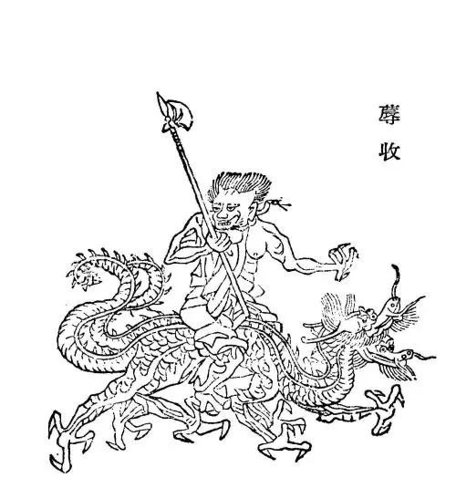 蓐收:人面虎身,身披金鳞,胛生双翼,左耳穿蛇,足乘两龙,西方金之祖巫。