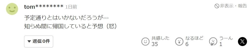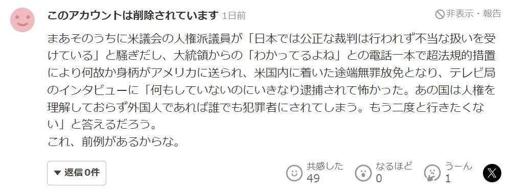 那么,这次这个美国人的情况会如何呢?让我们关注后续报道吧。虽然完全无法理解,但这次会不会又是对美国的卑躬屈膝式审判呢?”