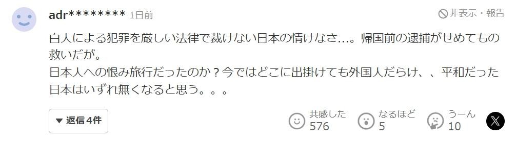“日本无法用严厉的法律制裁白人所犯的罪行,真是可悲…… 在回国前被逮捕,这至少算是一点救赎吧。
