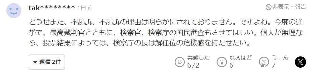 “反正又是不起诉,不起诉的理由也不会明确公布。是吧。在这次选举中,希望能对最高法院法官以及检察官、检察厅进行国民审查。如果个人做不到的话,根据投票结果,想让检察厅厅长有被解职的危机感。”