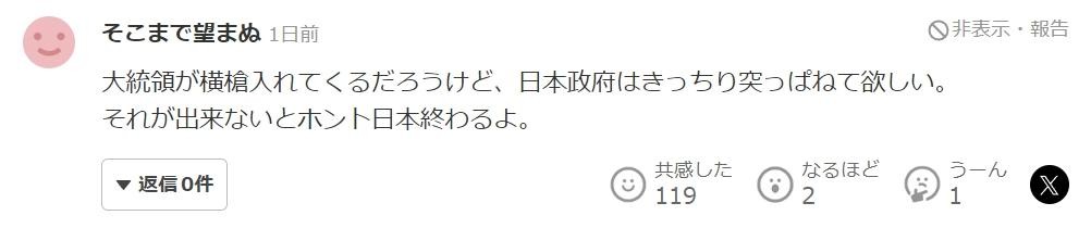 “虽然总统可能会横加干涉,但希望日本政府坚决予以拒绝。如果做不到这一点,那日本真的就完了。”