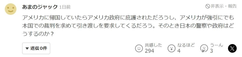 “如果回到了美国,应该会得到美国政府的庇护吧,而且美国可能会强行要求在本国进行审判并要求引渡。那个时候日本的警察和政府会怎么做呢?”