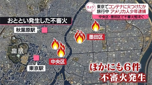 据警方透露,案发当天,东京中央区和墨田区,还发生了另外6起火灾!被烧的还都是垃圾回收箱。