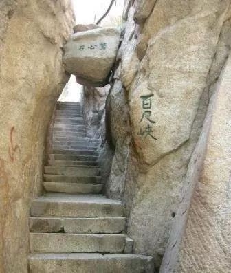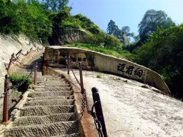 从玉泉院出发到北峰的登山通道汇集了众多惊险瑰丽的景观。在青柯坪东有一巨石,名叫"回心石",前面是华山头道险境千尺幢,体弱者到此石向导就会劝其回头下山,故名"回心石"。