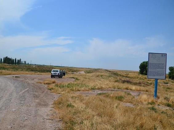 一片野草丛生的高地上,有一块路牌指示,阿克贝希姆村。1992年联合国教科文组织将这个遗址最终确定为碎叶城遗址,并树立了这一块指示牌。