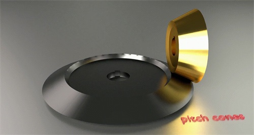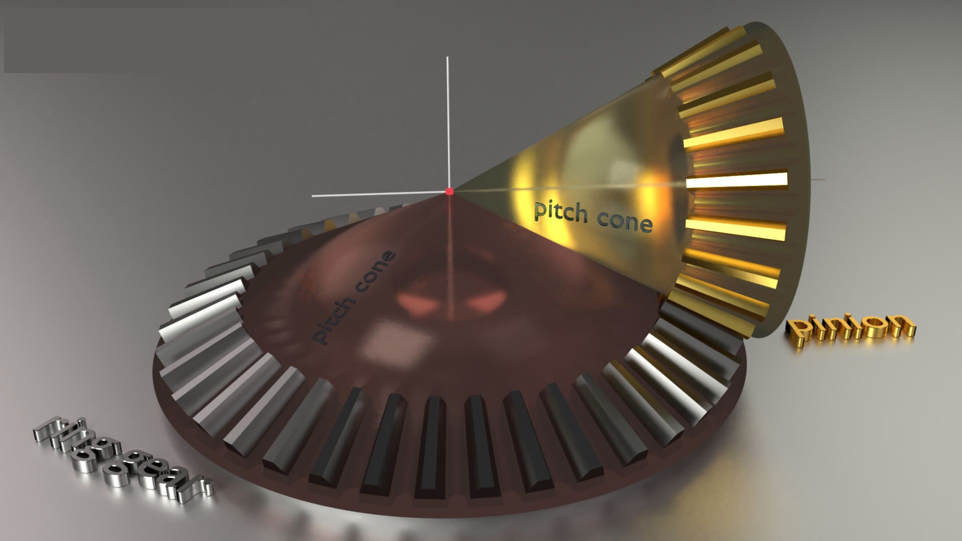 对于锥齿轮,齿轮的形状形成截锥(称为节锥),其中齿排列在侧表面上。两对锥齿轮的假想节锥相互滚动而不滑动。因此,在两个节锥的配合表面的相应接触点处的圆周速度是相同的。