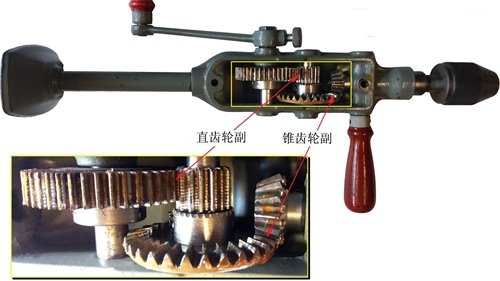 下图显示了手钻的示例。第一级传动是直齿轮,而第二级传动是锥齿轮,它也用于将旋转轴旋转 90°。曲轴的速度随着齿轮级的增加而增加,以获得钻头的高转速。