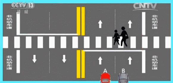 行人走到斑马线,到如下位置时,A车需要礼让,但B车可直行通过