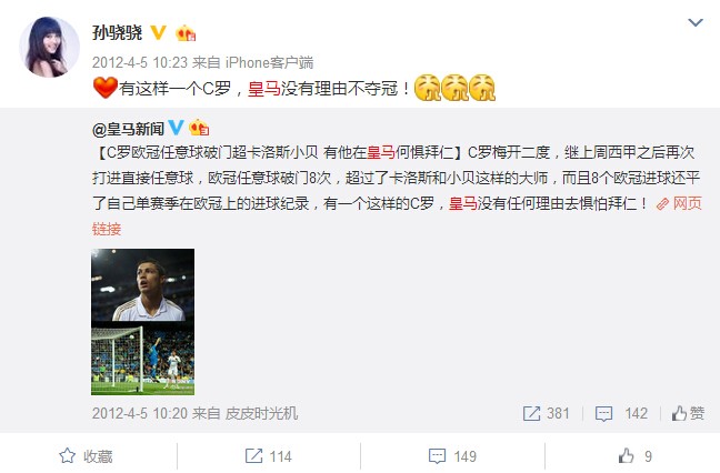 而孙骁骁则是皇马和C罗的球迷,她还曾经在微博上发过自己穿皇马7号C罗球衣的自拍照,也会在微博上为皇马的重要比赛加油,有意思的是孙骁骁和前皇马巨星卡卡的生日是同一天,都是4月22日。2012年李响在微博上为自己新书做宣传时,孙骁骁转发他的微博这样写道:“你支持皇马,我就支持你的新书!”