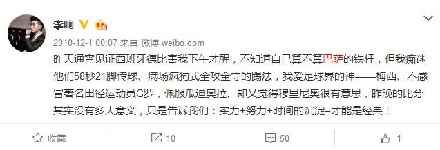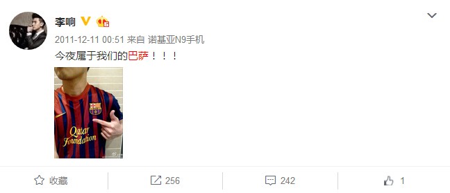 翻看李响的微博,他不但多次晒自己身穿巴萨球衣的照片,还经常会点评巴萨的比赛,并且和苏醒等喜欢巴萨的明星一起互动。2010年12月1日,李响在巴萨5-0大胜皇马之后发微博表达自己对巴萨和梅西的欣赏,还讽刺C罗是田径运动员。