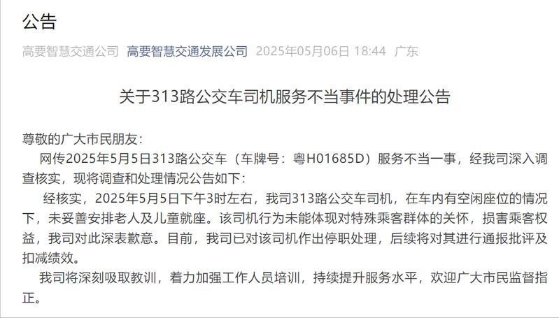 公交车空座一堆,司机却要求祖孙俩全程站着,停职就想了事?
