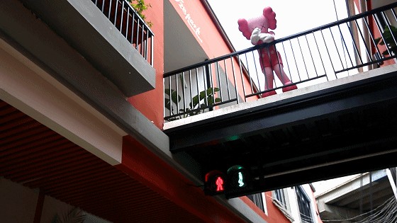 喷泉轻盈地洒出一朵朵水花,时间走得很慢,忍不住就会想多停留一会儿。旁边还有个跟人一样大的kaws公仔,潮人必合影~