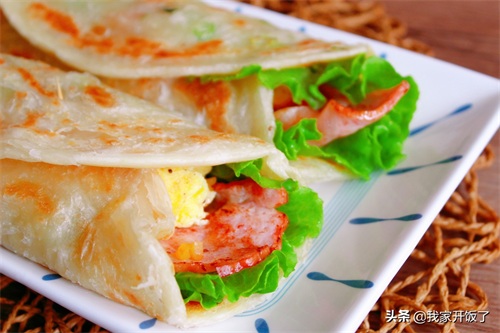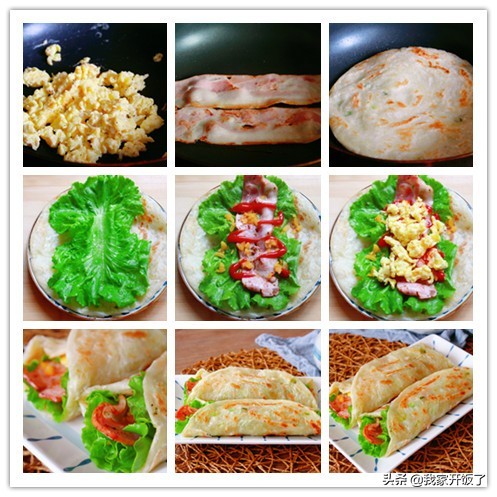 2.手抓饼煎到两面金黄,放上两片生菜叶,接着放培根、榨菜丁,挤入番茄酱。最后放入炒好的鸡蛋,卷起来就可以开吃啦。