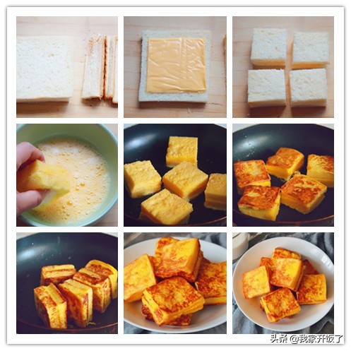 3.在芝士上面盖上一片吐司,切成四小方块,取其中一个裹满蛋液。