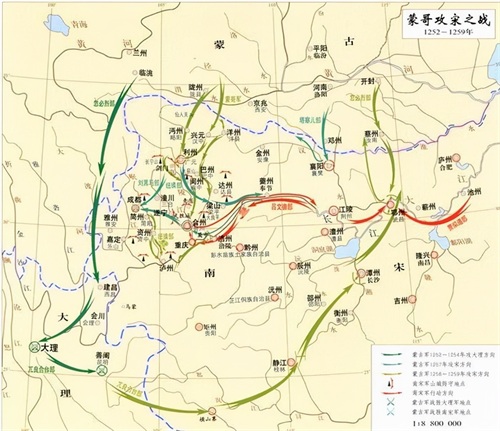 1258,蒙哥开始对南宋的全面大军。蒙古自己带领主力部队,大约4万军队(号称10万)进入四川,企图攻陷四川后沿着长江东进;忽必烈则坐着华北,在江汉、淮河一线对南宋形成牵制;兀良合台从大理出发,带领13000部队杀入广西、湖南。如果计算得以顺利进行,那么三路大军将在江汉一带会师,然而合兵东进拿下临安。