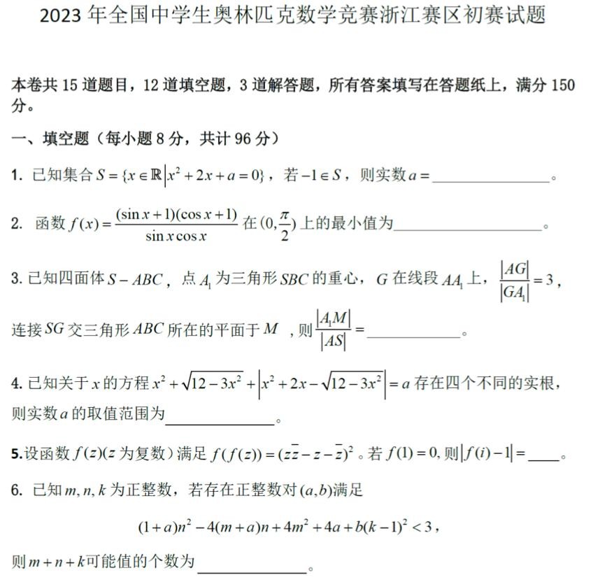 预赛 2023年浙江省高中数学竞赛已于5月21日在全省11个地级市同步开考,目前获奖名单已经公布。共有298位同学获得一等奖。杭州79人,温州74人,宁波68人,位居全省前三位。尚未获得参赛资格的同学还可以在7月的数学夏令营中继续考试获得资格,或通过教研员获得推荐资格。部分一等奖获奖名单如下