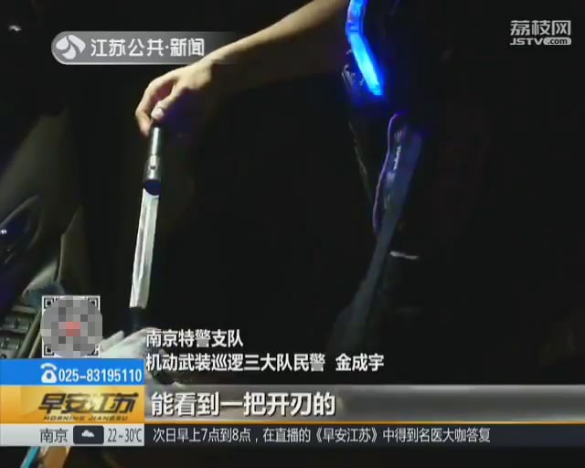 8月22日晚9点开始,南京特警支队机动武装巡逻三大队民警联合玄武分局巡特警大队,对玄武区长江后街展开联合清查。在一辆黑色轿车中,民警查到了一根棍状物,在仔细检查后,才发现这竟然是一把管制刀具,开刃长达20厘米。