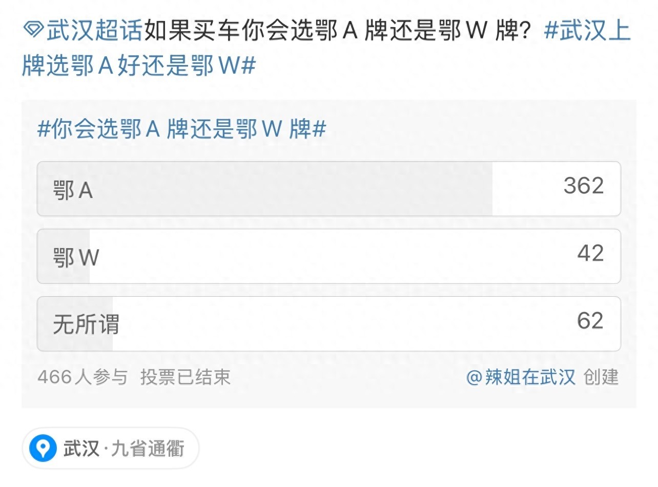近日,“武汉上牌选鄂A还是鄂W”的相关话题引发热议。根据一博主发起的投票结果来看,选择“鄂A”占参与者的大部分。