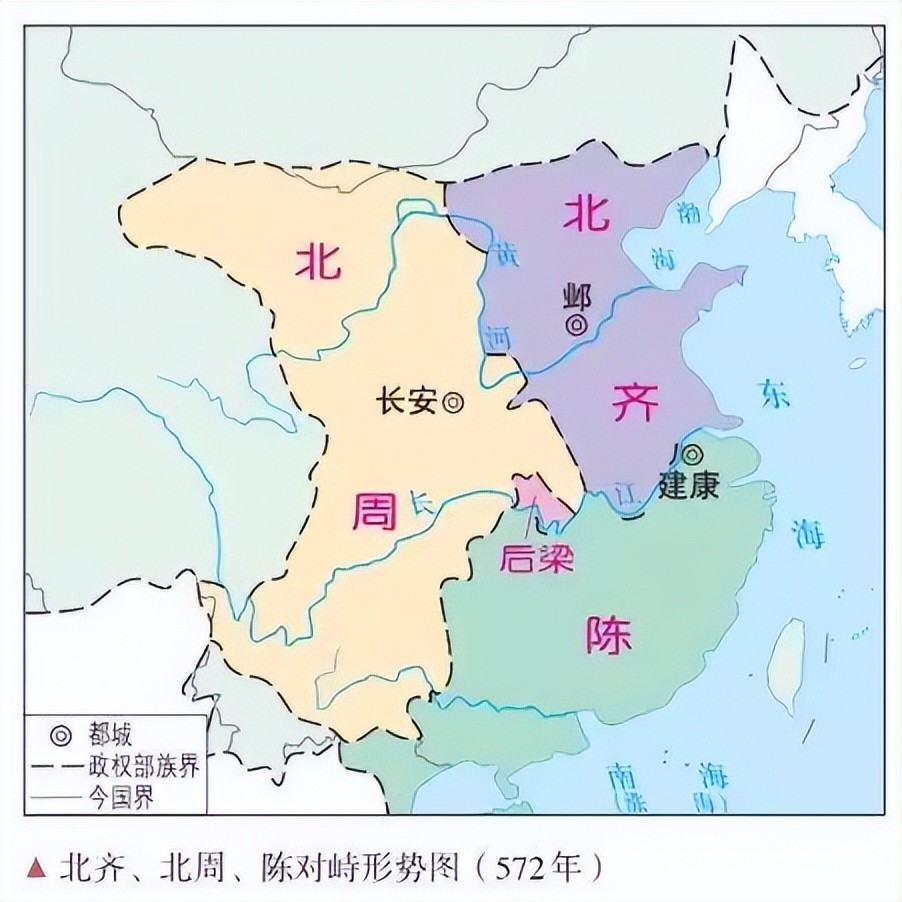 557年陈霸先受梁禅,是为南朝陈朝;传至589年为隋所灭。550年东魏高洋废其主自立,建号齐,史称北齐;传至577年为北周所灭。557年宇文氏废西魏帝自立,建号周,史称北周;传至581年禅于隋。本图以572年即陈太建四年、齐武平三年、周建德元年为准。次年,陈攻齐取淮南;后二年周攻齐,又二年灭齐。
