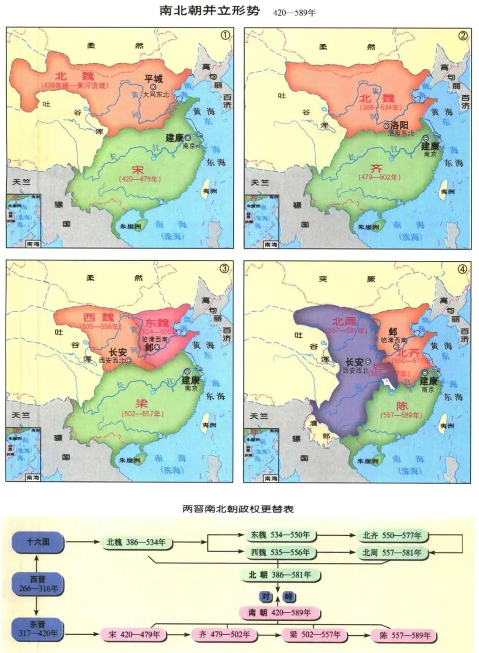 420年刘裕受晋禅称帝,是为南朝宋朝,传至479年禅于齐。北朝始于鲜卑拓跋氏的魏,原先是十六国时的代国,338年称王建号,376年为前秦所并,386年复国,同年改号魏,398年称帝。439年灭北凉完成北方统一,史称北魏。传至534年,分裂为东西二魏。本图以449年为准,南朝为宋元嘉二十六年,北朝为魏太平真君十年。其明年,南北爆发大战,从此南朝转衰,北朝转盛。
