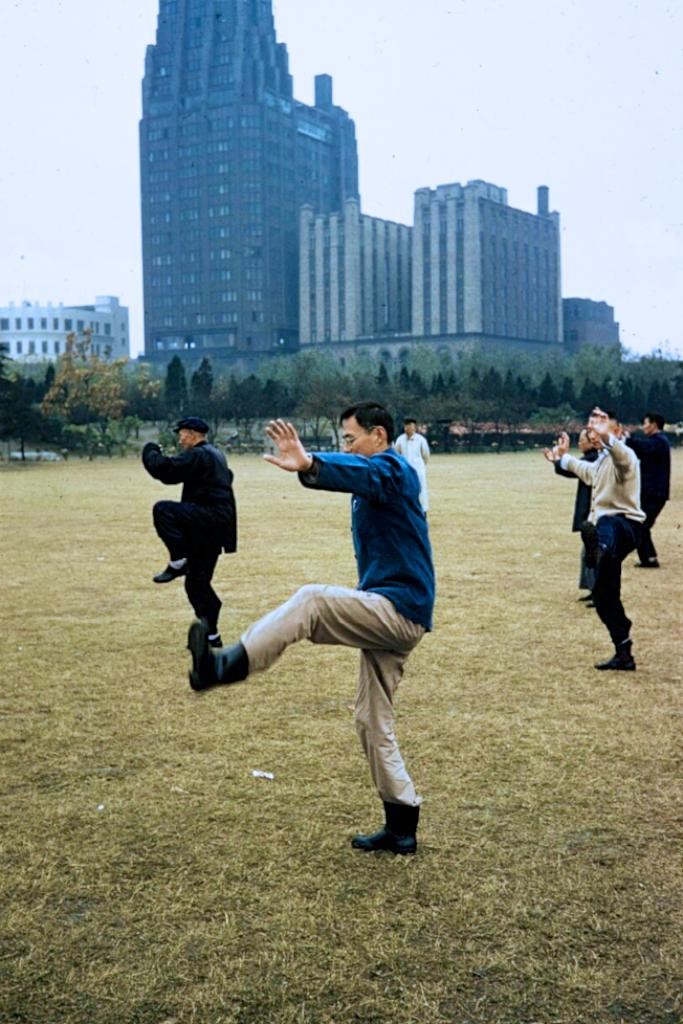这也是拍摄于人民公园的照片,照片当中一群老大爷正在晨练打太极。人民公园园址为旧时跑马厅(北半部)。1894年,公共租界以年租六百两规银,租用该地建设公共娱乐场。新中国成立之后,为了让身处闹市的市民,有休闲放松、体验大自然的地方,国家明确规定此地为绿地范围,不准修建任何建筑。