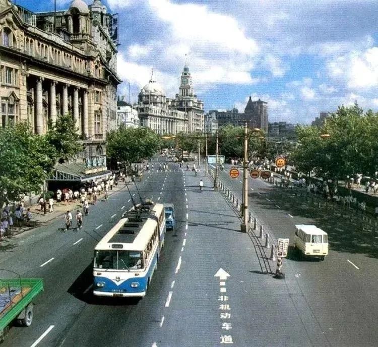 这张照片当中有一辆急速行驶的电车,不知道老上海人对电车还有没有映像,有轨电车在上个世纪70年代底的时候,上海已经取消了有轨电车电车这种交通工具,全部改成公交。所以,70年代以后出生的人,基本上没有见过有轨电车这种事物。