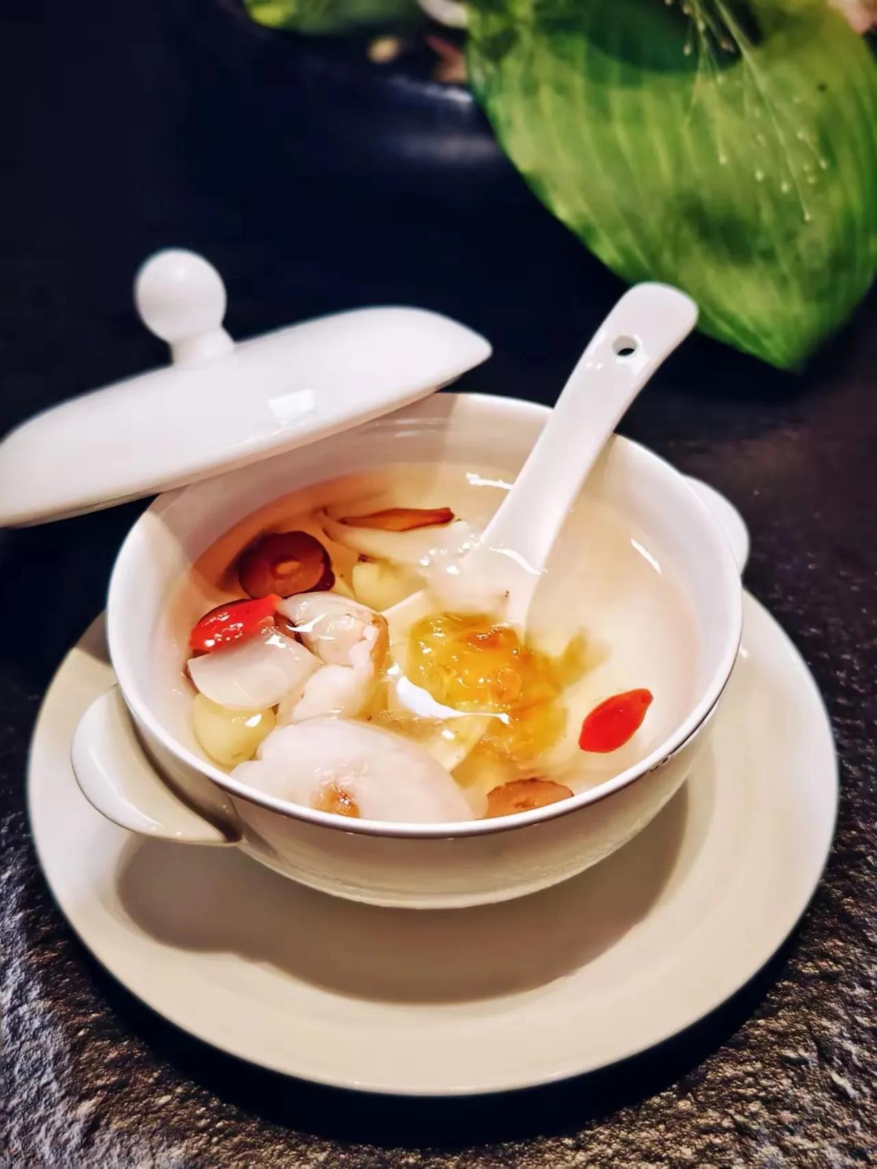 炖是清炖或配以药材同炖,一般是将主料飞水后,放在炖盅内,加入汤水,上蒸柜顿适当的时间,原盅上席。特点是清而不淡、浓而不腻,汤水营养价值高,滋补养颜。如:虫草炖水鸭、淮杞炖水鱼等。