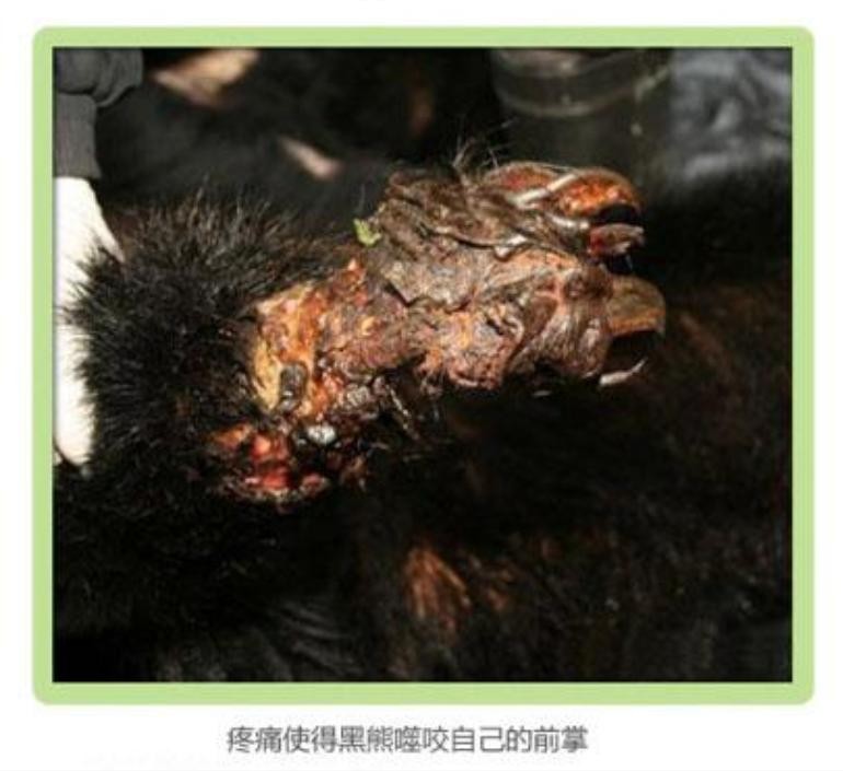 还有很多成年的胆熊因为实在无法忍受取胆汁的痛苦,拼命的撞击自己的铁马甲,露出自己的伤口,然后不断的撕扯自己的伤口,直到无力的躺下,被人割走熊掌,成为桌上的美味。