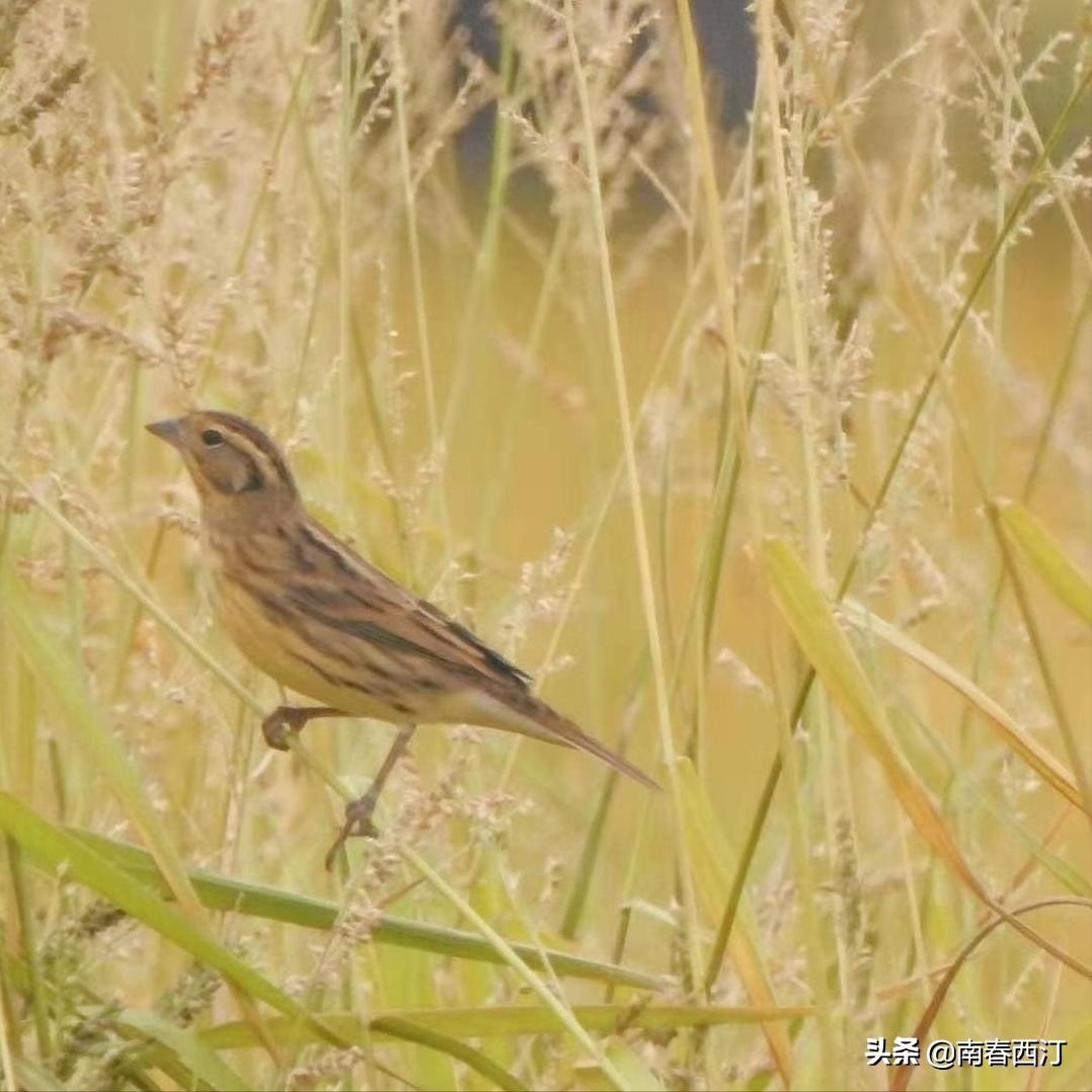 10月的时候,作者与一群热爱自然的朋友们参与了对黄胸鹀数量的调查。在一片稻田之中,我们发现了黄胸鹀,是一只成年的雌鸟。她站在苇杆上进食,草丛里躲着另外两只。身上的条状纹路使它与麦田融为一体,躲开了天敌。哪怕是一群人举起相机对着它一顿咔嚓,也只是自顾进食。