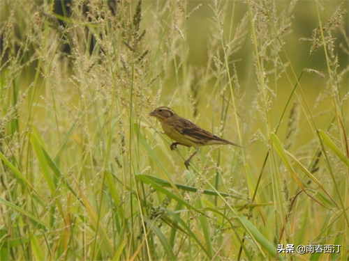 正在稻田进食的黄胸鹀雌鸟 南春西汀摄 保留所有权利