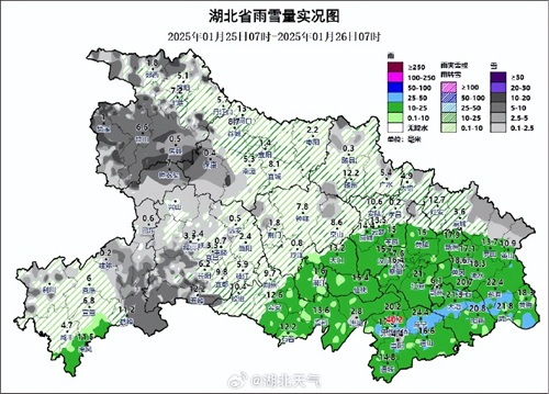 昨日07时至今日07时,十堰、襄阳、神农架、恩施、宜昌、荆门、荆州西部、随州、孝感北部、武汉北部、黄冈北部出现雨夹雪或雪,西部500米以上山区中到大雪、局地暴雪,积雪深度一般4~8厘米、局地10厘米以上,积雪较深的有神农顶20厘米、武当山15厘米、郧西店子镇12厘米。