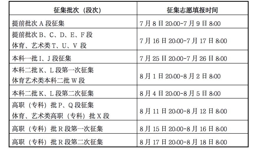 (T段、U段、V段),体育、艺术类本科二批(W段),体育、艺术类高职(专科)批(X段)。