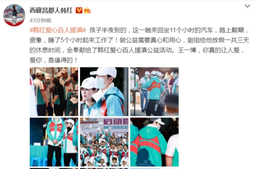 王一博无论工作多忙也是会积极地参与到公益活动中来。在韩红组织的百人援滇过程中,王一博就积极地参与到此次行动中,可以说在这期间王一博是身先立足,一直在公益最前线,韩红对于王一博的行为十分的认可,连续两次在社交平台发文称王一博属于正能量。