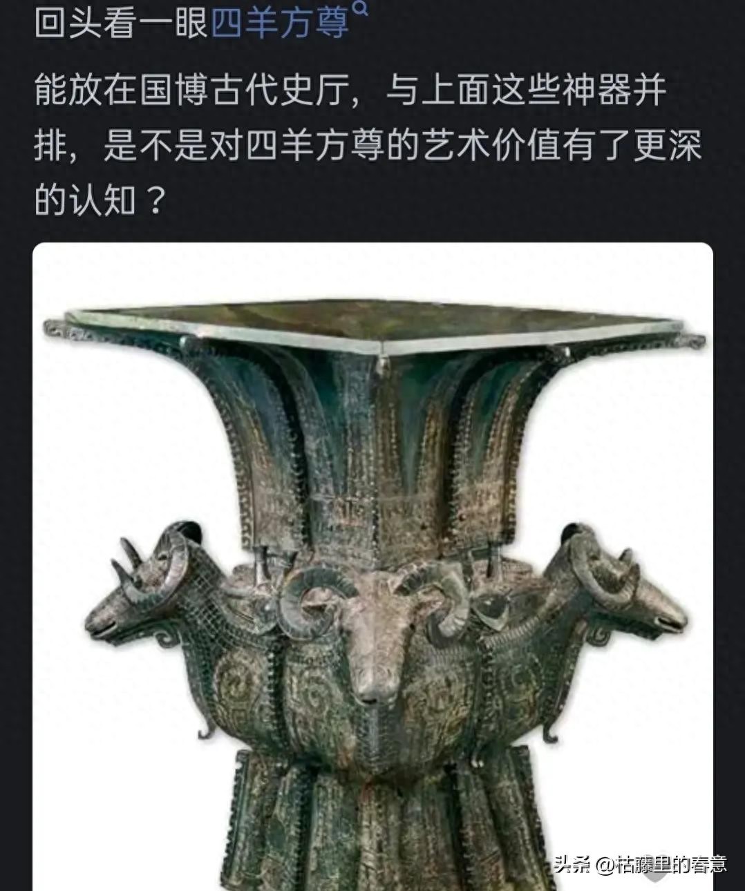 通过这一连串的讨论与分析,我们不难发现,一个文物是否能够成为镇馆之宝,不仅仅是看其艺术和工艺价值,更需要考量其历史文化的深度和广度。四羊方尊的故事提醒我们,对于每一件文物,我们都应保持一份敬畏之心,细致入微地探索其背后的历史脉络与文化精神,这样才能更好地传承和利用这些不可多得的文化遗产。