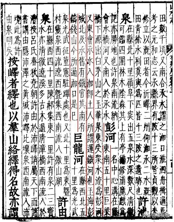 对此,《兖州府志·山水志》云:“彭河,一名中心沟,在县东南五十里巨梁桥下,源出白茅山之玉华泉,东受众水流为彭河。又东汇承水入泇,即土人所谓运铁河也。”