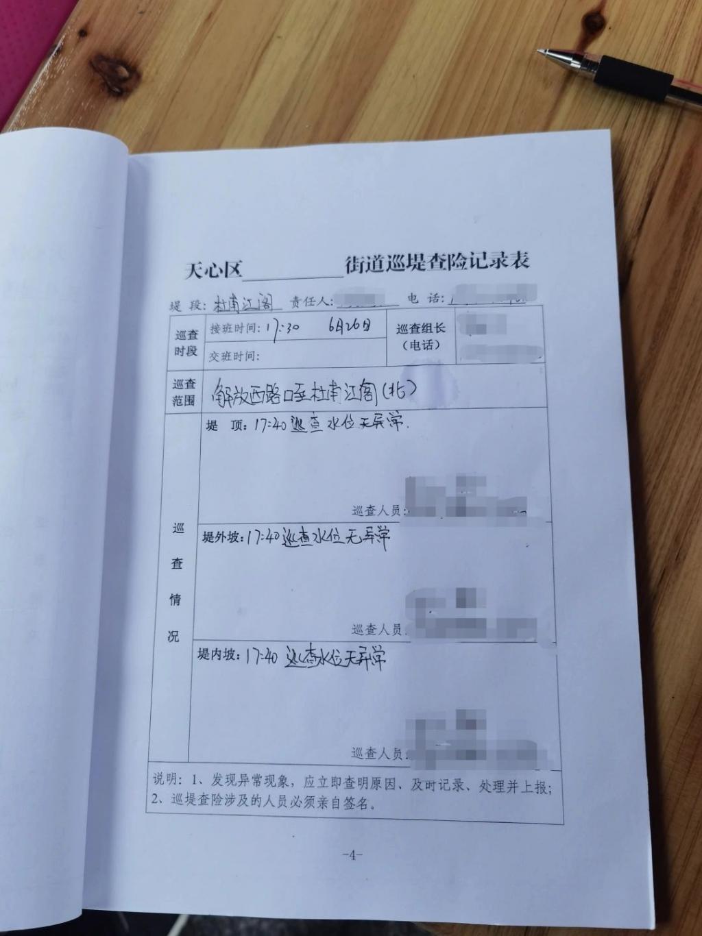 在巡堤查险日志本上,街道工作人员认真记录了巡查时段、范围,对堤顶、堤外坡、堤内坡水位和土质情况都做了详细记录。